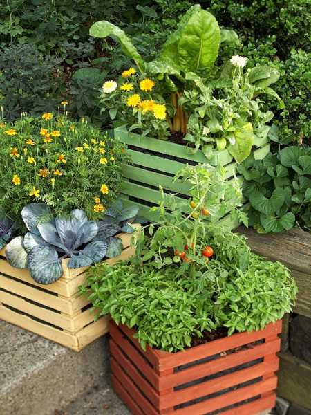 Красивый огород, так же как и цветы, можно вырастить в контейнере и украсить ими террасу.