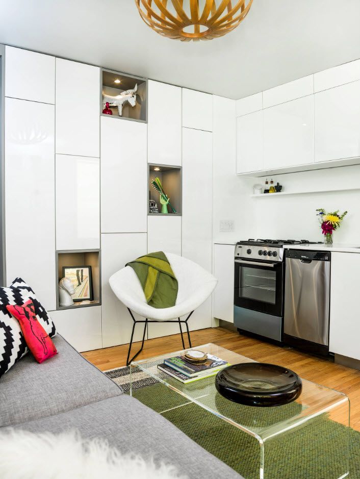 Приобретая или заказывая мебельные комплекты для тесной квартиры, рекомендуется обращать внимание на строгие минималистичные модели. Богатая резьба, филенки, крупные рисунки и заметная фурнитура будут выглядеть неуместно при скромных габаритах помещения.