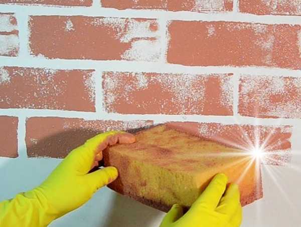 Очистить стену от шпаклевки до самого основания довольно сложно и ее состояние будет потрепанным и частично оббитым. Поэтому при желании оформить акцентную стену в виде кирпичной кладки, можно использовать обычную прямоугольную губку подходящего размера. Ее окунают в емкость с краской и прижимают к стене, имитируя кладку.