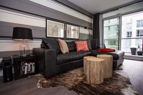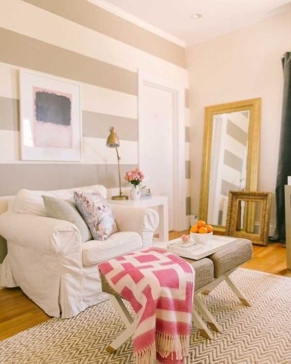 Вы можете внести некоторую динамику в оформление комнаты, если сделаете стены полосатыми. Тут даже можно чуть-чуть скорректировать пространство: отдалить потолок от пола, если полосы направить вертикально, или расширить пространство комнаты с помощью широких горизонтальных полос. Учтите, что ширина полос не обязательно должна быть величиной постоянной для всех стен.
