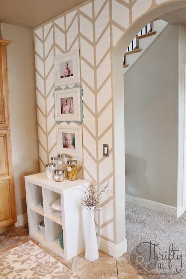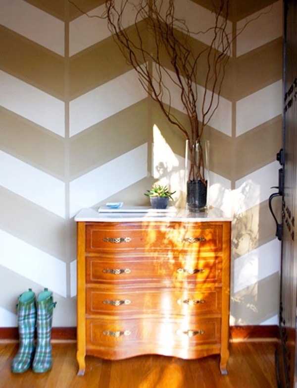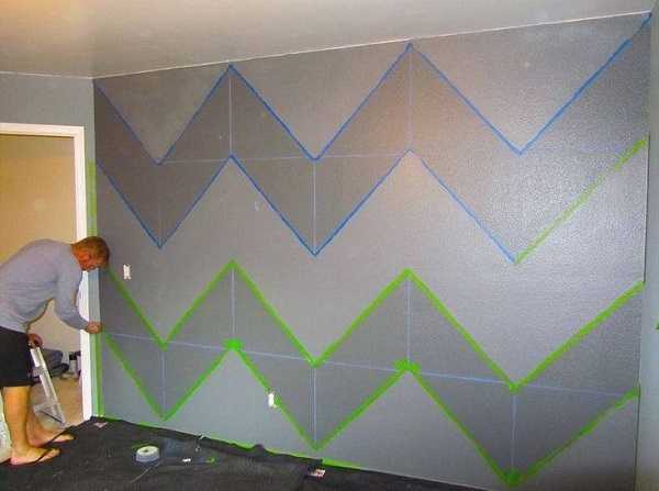 Современная мода увлеклась рисунком шеврон, V-образные элементы которого являются основой многих орнаментов. Фактически мы имеем в результате давно знакомый зигзаг, который в переложении на рисунок стен дадут ломаные полоски. Их выполнить сложнее, чем простые прямые полосы, но всё-таки по силам хозяину квартиры. Расчерчивать стены придётся с помощью линейки, в интернете можно найти подробную инструкцию.