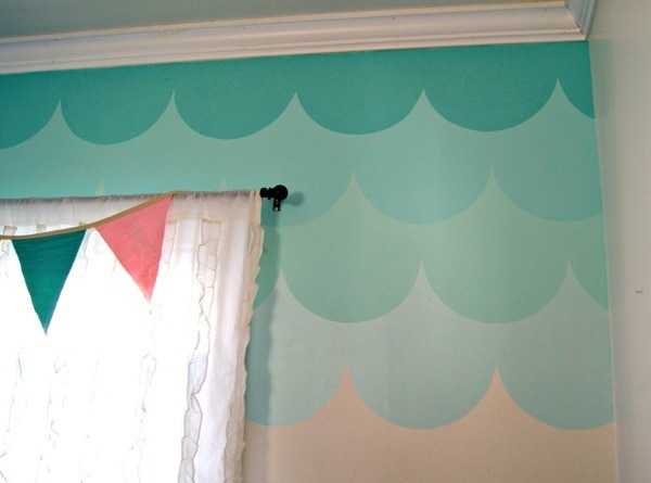 Заранее надо подготовить трафареты подходящего размера. Если рисунок будет большим, его распечатывают на нескольких листах формата А4 и склеивают между собой. Главное оставлять поля для склеивания. Трафарет крепят к стене малярным скотчем и зарисовывают вырезанные отверстия. Это могут быть перья, ракушки, дерево, облака, цветы, животные и многое другое. Все зависит от фантазии и выбранного стиля. Когда рисунок высохнет, трафарет можно убрать.