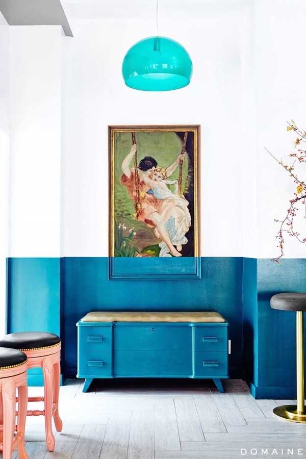 Такой частичный способ окрашивания стен несёт в себе оттенок иронии, особенно, когда вместе с фрагментом стены закрашивается общим цветом и какой-нибудь посторонний предмет: часть двери, или мебели, или декоративного объекта.