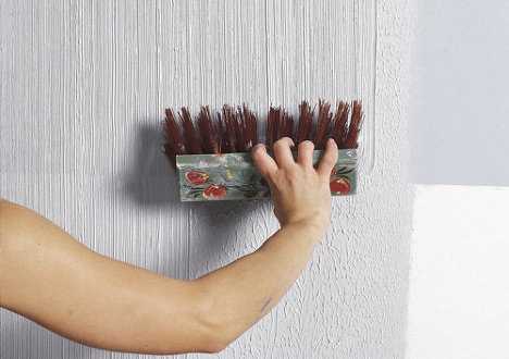 При помощи веника или метелки можно создать структуру с еле заметными вертикальными полосами. Чтобы покраска выглядела более интересно, можно нанести первым слоем светлую краску, а вторым – темную. Использовать лучше всего текстурную краску, она более плотная и рисунок на ней сильнее выражен.
