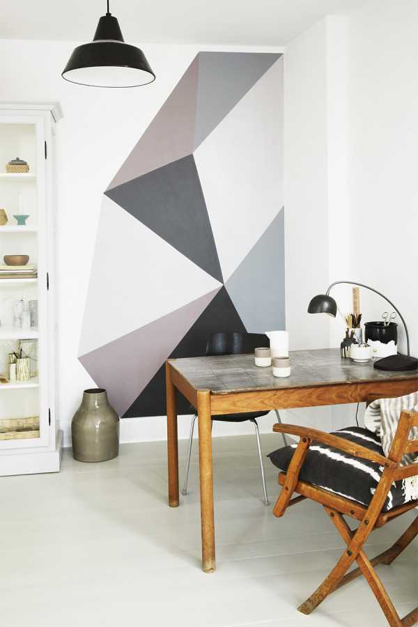 интересная художественная дизайнерская геометрия своими руками, модная и необычная идея оформления помещения брызгами с узором или геометрическими фигурами