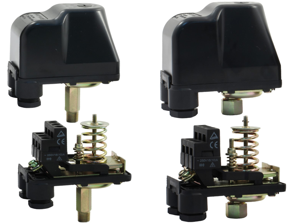 Кроме того, некоторые реле давления дополнительно оснащены механической пусковой кнопкой, позволяющей принудительно включать-выключать датчик давления, а также клапаном разгрузки и шкалой настроек.