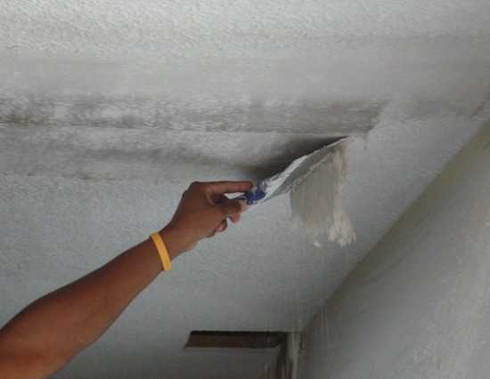 Если же потолок был окрашен влагостойкой краской, то работы по демонтажу отделки несколько усложнятся. Можно использовать ленточную шлифовальную машину или дрель со специальной насадкой: краска снимется относительно легко, но пыли будет много, поэтому позаботьтесь о защите сантехники и мебели, а все работы проводите в респираторе. Есть еще термический способ, предполагающий использование строительного фена, им нагревается участок краски, который затем снимается с помощью шпателя. Альтернативный вариант – метод шоковой терапии: сначала поверхность краски трется металлической щеткой до образования многочисленных царапин, потом смачивается теплой водой и снова трется щеткой, можно дополнительно устроить сквозняк. После всего этого краска должна сама отпадать слоями.