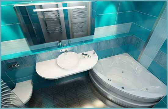 Поскольку дизайн ванной не привязан так к физиологии, желательно «подтянуть» его к дизайну туалета (см. статью о ремонте туалета). Вариант – разделение объема ширмой, но в и так маленьком помещении это не очень привлекательно. Еще вариант, дорогой, но эстетически великолепный – визуально увеличить объем помещения. Этого легко добиться с помощью облицовки зеркальной плиткой, см. рис. Лучшая и самая дорогая плитка – акриловая.