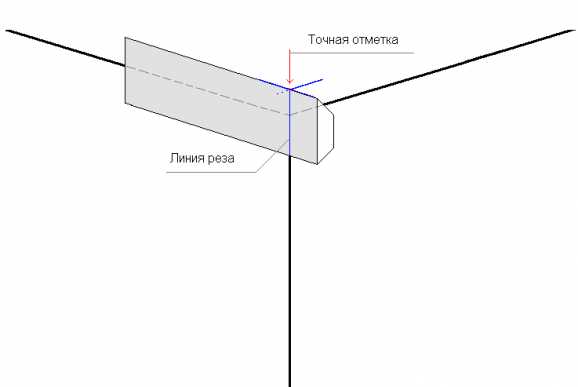В первую очередь нужно рассчитать, какую длину должен иметь потолочный плинтус, примыкающий к углу. Две заготовки обрезаются под углом 900. Далее, нужно одну из планок приложить в угол. Ее торец должен упереться в стену. Вдоль изделия простым карандашом проводим линию.