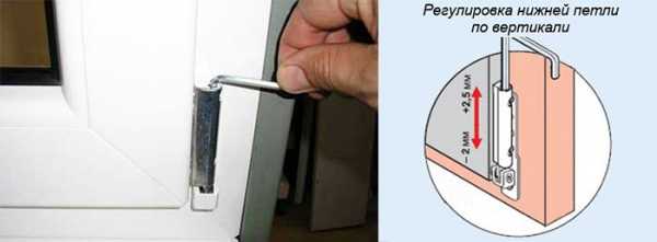 - Закрываем створку и подкручиваем регулировочный винт на нижней петле. Таким образом регулируется положение створки в вертикальной плоскости. Поворотом вправо ее поднимают, влево — опускают.