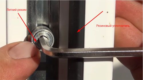 Сначала нужно открыть створку и найти сбоку эксцентрики. Если рама имеет стандартные размеры, их должно быть три. Когда окно находится в летнем режиме, маркер на эксцентрике указывает в сторону улицы. Чтобы изменить режим, его нужно повернуть так, чтобы он указывал в сторону помещения. Руками это сделать не получится, поэтому придется прибегнуть к помощи подходящего инструмента. Обычно его роль играет шестигранник.