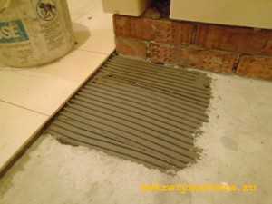 Плиточный клей наносится только зубчатым шпателем и обязательно на две склеиваемые поверхности. Наносить нужно с прижимом, как-бы притирая к поверхности как плитки, так и основания.