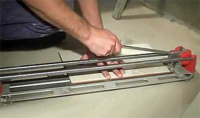 - Вверху прибора есть каретка с колесиком и упором, которая двигается по двум направляющим. Эту каретку нужно отвести в сторону от себя. Далее к краю кафеля приставляется колесико и с нажимом производится срез.