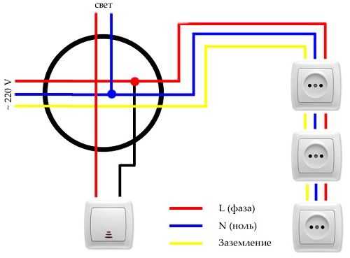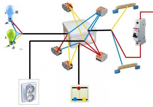 Так, провода «ноля» (на схеме они синие) и кабели заземления (обозначены желтым) соединяются соответствующим образом по цветам, как продемонстрировано на изображении. При обустройстве двухпроводной электропроводки схема остается такой же, исключаются лишь провода заземления.