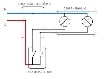 В случае же подключения через распределительную коробку выключателя с двумя клавишами в условиях трехпроводной электропроводки на люстру пускают кабель с четырьмя жилами. Если проводка двухпроводная, количество жил сокращается до трех, т.к. заземление исключается из схемы, как показано на рисунке.