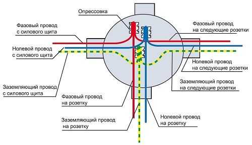 Без учета отдельной скрутки заземлителя, в коробке создается 4 соединения. Все провода «нули» (обозначены синим) соединяются друг с другом.