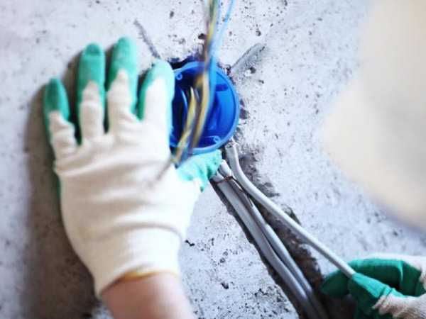 - Заподлицо со стеной устанавливается коробка подрозетника (провода заводятся внутрь него, а перед этим их концы надо замотать изолентой, чтобы на жилы не попал гипсовый раствор). Потом надо выждать положенное время, чтобы раствор полностью затвердел – в зависимости от состава это может занять от 15 минут до суток.