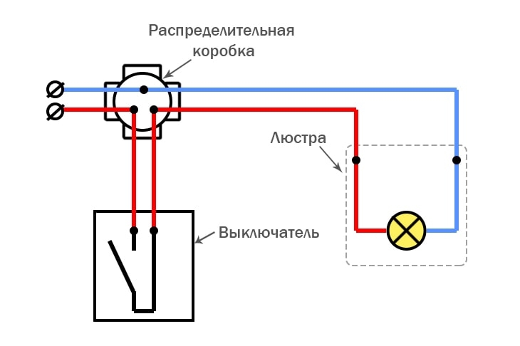Схема электропроводки с коммутацией в распределительной коробке при подключении одноклавишного выключателя к люстре показана ниже.