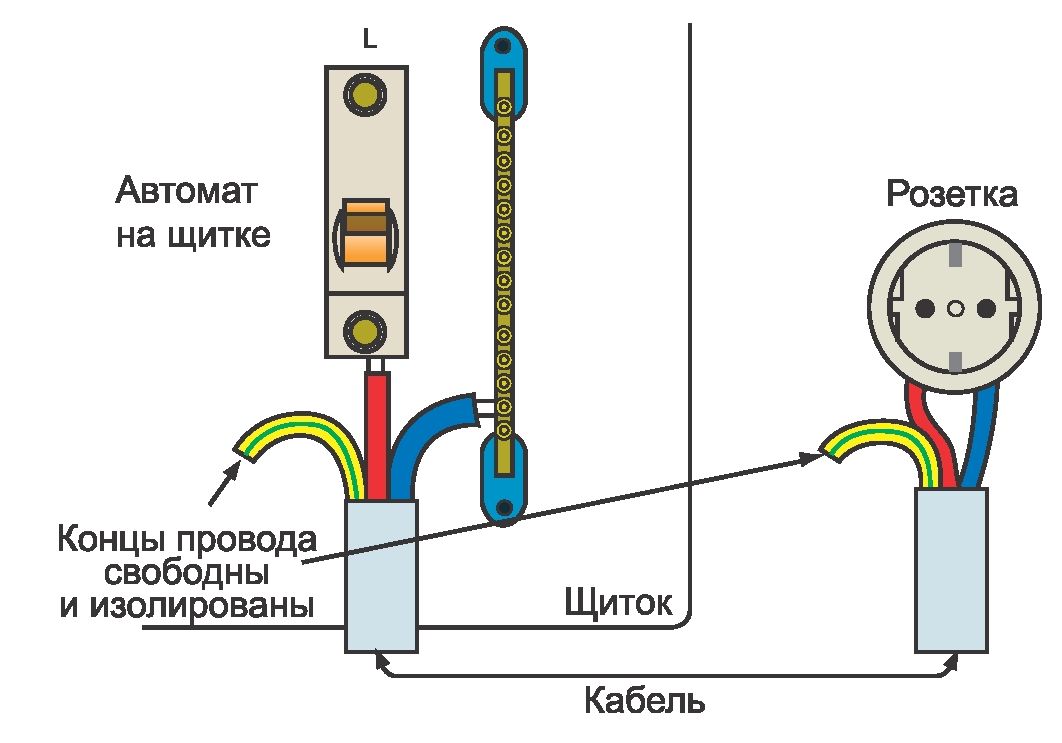 - от распределительной коробки нужно проложить трехжильный провод, к розетке подключается заземление, ноль и фаза;