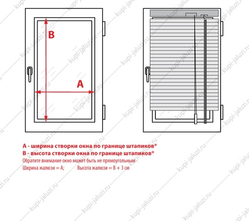 1. В том случае если жалюзи будут крепиться в оконный проем, надо замерить ширину верхней части окна и вычесть из нее 2 см, это будет ширина жалюзи. Затем следует измерить высоту проема слева и справа, выбрать наименьшее значение, вычесть из него 1 см, полученный результат будет равен длине жалюзи. Кроме того надо определиться со стороной управления (левой или правой), а также направлением в которое жалюзи будут открываться.