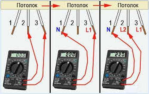 Если индикатор светится от всех проводов — воспользуйтесь неоновым индикатором. а не светодиодным. 1 провод общий (правильно — 0 ) На 2 других появляется напруга когда клацаете выключателем, и пропадает — когда выключаете. Общий — к проводу люстры, соединённому с внешними контактами патронов, включаемую фазу — к проводу, соединённому с центральными лепестками-контактами патронов.