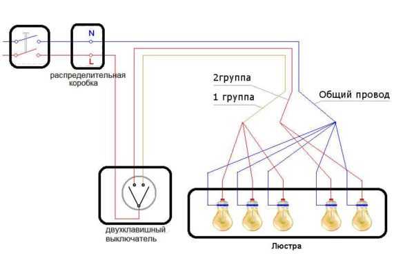 Подключение пятирожковой люстры к двойному (двухклавишному) выключателю