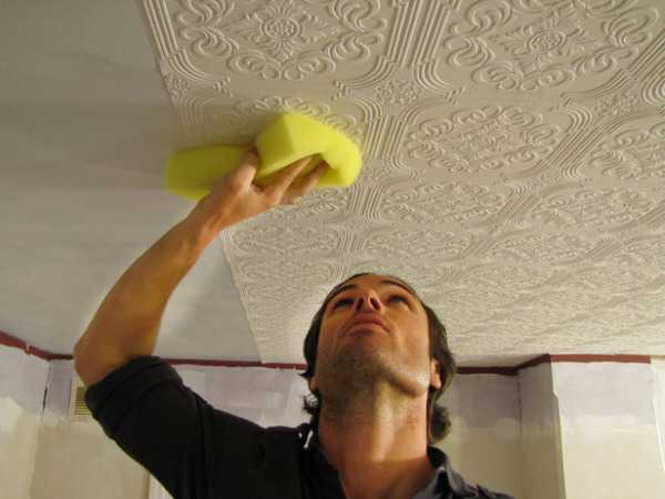 Первым делом займитесь подготовкой поверхности: потолок должен быть чистым и сухим. Хорошо, если вы загрунтуете его перед оклеиванием.