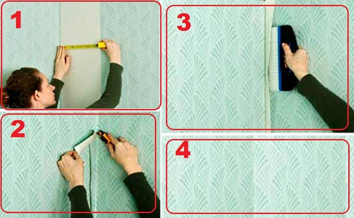 Важно! Благодаря качеству виниловых обоев, некоторые мастера не разрезают их заранее, а приклеивают прямо из рулона. На потолке делают небольшой напуск, который позже отрезают строительным ножом, а снизу обрезку делают по плинтусу.