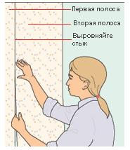 Лишние края снизу и сверху аккуратно удаляют ножом, удерживая их шпателем. Вторую полосу приклеивают аналогичным способом стык в стык к первой. Места соединения тщательно прокатывают резиновым валиком бочкообразной формы.