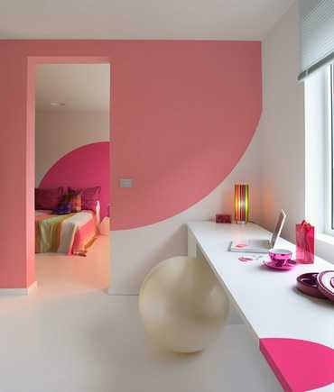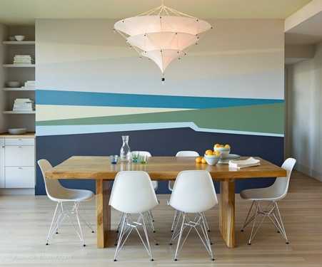 Линии цвета могут повторять формы мебели, декора и прочих интерьерных деталей. Это прекрасное решение для современных интерьеров и для помещений в ярком стиле поп-арт.