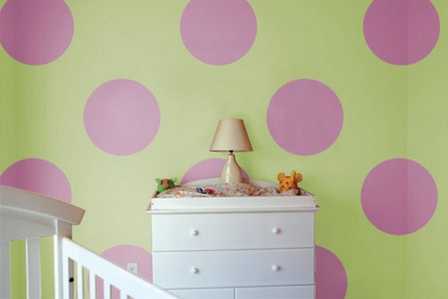 Эта идея обычно находит воплощение в детских комнатах. Хотя уместен горошек и в гостиных, спальнях, кухнях, если речь идет о таких стилях, как кантри и ретро. Покрасить стены в горошек легко: сначала нужно окрасить стены более светлой краской, затем по трафарету, пользуясь кистью или губкой, нанести другой цвет или несколько других цветов в виде хаотично или систематически расположенных кружков.