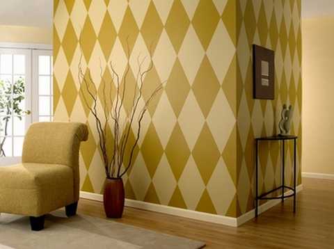Покраска стен ромбами заставит повозиться. Сперва нужно окрасить стену в более светлый из выбранных цветов. Затем, когда краска высохнет, сделать разметку будущих ромбов. Определиться, каким будет их чередование. Отметить, какие ромбы будут более темными, а какие останутся светлыми. По границе ромбов, которые требуется окрасить в более темный цвет, наклеить малярный скотч (наружу от линии разметки). Окрасить поверхности внутри разметки и снять скотч. После полного высыхания краски можно провести сплошные или пунктирные линии, пересекающие стороны ромбов. Это увеличит схожесть со знаменитым узором вязки.