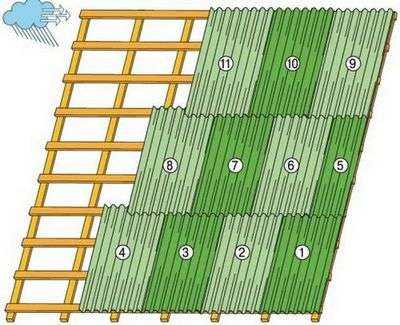 Как видите, преимущественное направление ветра – справа налево. Поэтому первый лист укладывается в нижнем левом углу.