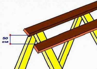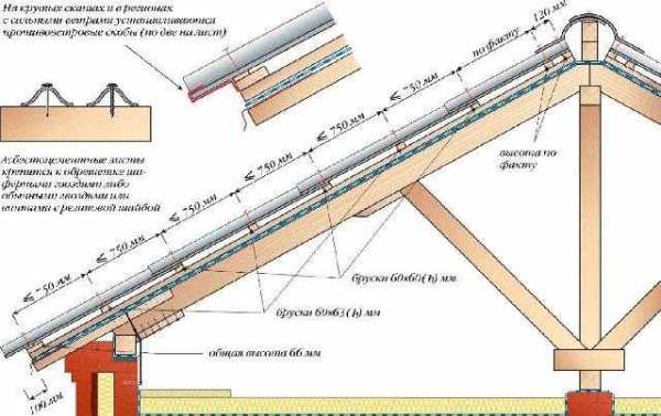 Обрешетка под шифер делается из бруса толщиной 50-60 мм. Шаг обрешетки составляет 750 мм. Это позволит крепить каждый лист к трем брускам обрешетки и еще останется небольшой вылет для нахлеста другого ряда, как показано на рисунке ниже:
