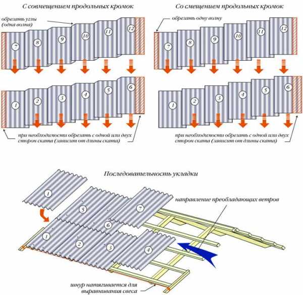 В первом случае шифер укладывается поверх волны предыдущего. Это один из самых простых способов, поэтому его используют чаще всего. Но в итоге на краю крыши кромка будет не ровной, придется обрезать, что влечет за собой лишний расход материала. При укладке с совмещением кромок материал расходуется самым экономичным образом, но работа более кропотливая.