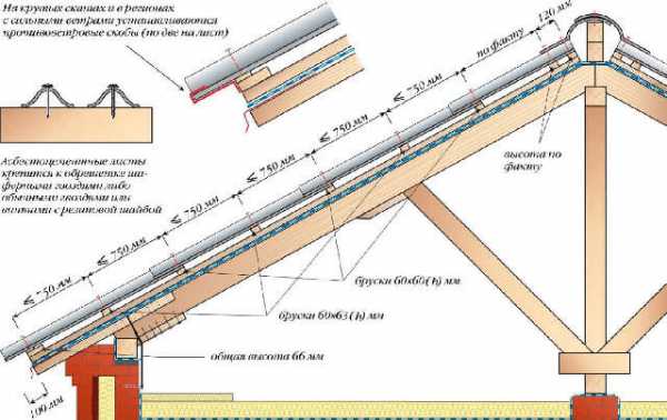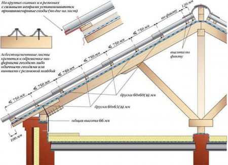 Для стандартного профиля сечение брусков должно быть 5 на 5. Если говорить об усиленном профиле, данный показатель должен составлять 7,5 на 7,5. Шаг обрешётки при этом может составлять от 0,5 до 0,8 м. Желательно укладывать листы шифера на слой рубероида — такой подход позволяет существенно утеплить кровлю.