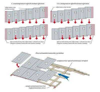 Выбор способа зависит от конфигурации крыши и других фактических условий. Если конструкция имеет широкий горизонтальный скат и маленький вертикальный, рекомендуется проводить монтаж со смещением на одну волну. При использовании этого способа карнизный свес не устраивают. Второй способ используют, если у кровельной конструкции скат не широкий по горизонтали и длинный по вертикали. У некоторых листов придется отпиливать углы (следует также следить, чтобы в углу не перекрывались одновременно четыре листа). При укладке слева направо, необходимо срезать левые углы, при варианте справа налево #8212; правые.
