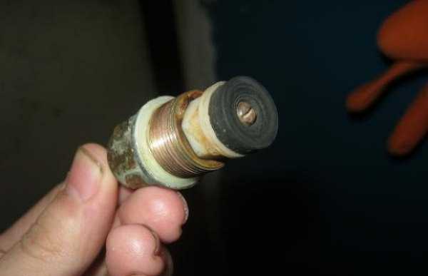 - На внутреннем конце подвижного штока установлена металлическая тарелка клапана. В ее торце расположен латунный винт, который нужно выкрутить, а затем удалить старую резиновую прокладку.