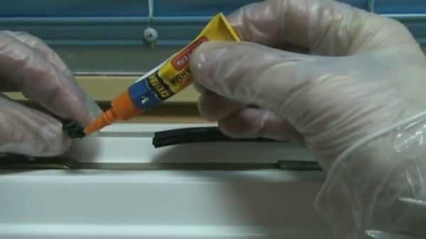 Последовательные этапы работ по замене резинкиПосле того как замена уплотнителя пластиковых окон была выполнена, излишек отрезается ножницами. В результате образуется всего один стыковочный шов, который будет располагаться в любом из углов рамы. Его скрепляют клеем.