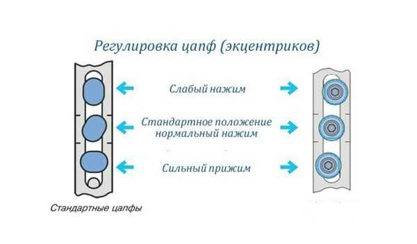 Регулировка степени прижатия створки к раме производится с помощью запорных механизмов (цапф), расположенных на боковых и верхних торцах створок. Внешний вид, количество и место расположения этих устройств может различаться в зависимости от производителя и ценовой категории стеклопакета.