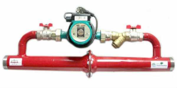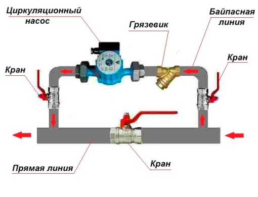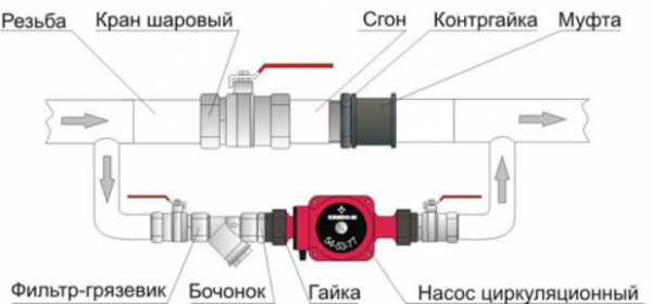 - При необходимости монтажа байпаса его лучше собрать отдельно, установив все элементы арматуры и циркуляционный насос. Останется лишь сделать врезку в трубу.