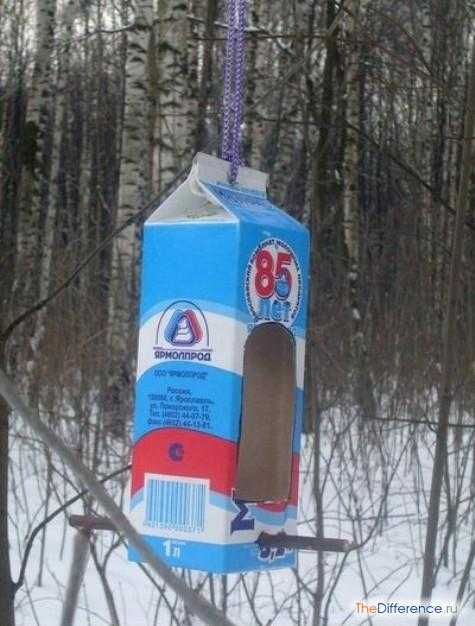 Каждый месяц мы выбрасываем по несколько десятков картонных пакетов из-под сока и молока. И зря, ведь можно найти им очень полезное применение. Расскажем подробнее, как сделать кормушку для птиц из коробки подобного типа. Взяв предварительно вымытую и высушенную картонную тару, вырезаем на лицевой стороне просторное отверстие и насыпаем на дно лакомство для пернатых. Останется лишь проделать дырочки в верхней части приспособления, продеть в них веревку и закрепить кормушку на ветке дерева. Уместно будет оснастить «столовую» и удобной жердочкой из веточки. При выборе подходящей коробки стоит отдавать предпочтение изделиям из плотного картона максимально ярких расцветок. Очевидно, что такую кормушку сложно назвать надежной и долговечной. Как показывает практика, срок ее службы составляет буквально пару месяцев (фото).