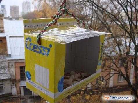 Весьма неплохие кормушки выходят из коробок от мелкой бытовой техники. Они уже оснащены и крышей, и достаточно прочным основанием. Нужно только вырезать прямоугольное окошко и сделать дырочки для продевания веревки. Чтобы «столовая» стала более защищенной от внешних факторов, следует обклеить ее широким скотчем, в идеале – с использованием целлофановой прослойки (фото).