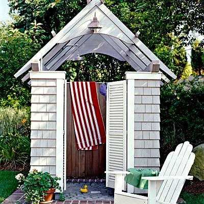Наконец, душ желательно строить на менее заметной территории, скрытой от любопытных взоров, например за фасадом дома или за близлежащей пристройкой.
