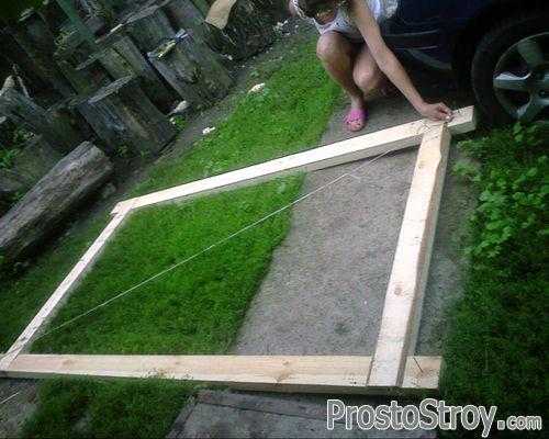 - Далее с учетом толщины стройматериалов, на земле размечается прямоугольник 110х170 см.