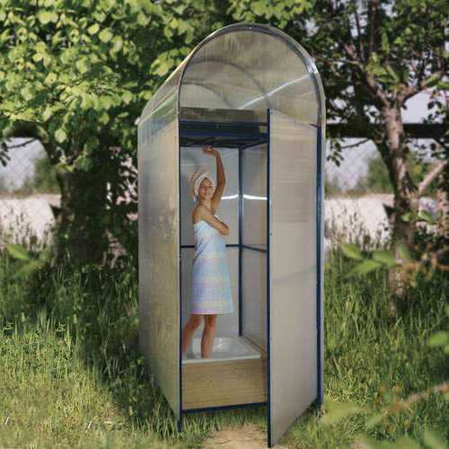 Если вам не хочется особо заморачиваться сооружением душевой кабины, то сегодня можно приобрести готовый вариант. Замечательно альтернативной самодельной кабине служит летний душ из поликарбоната. Его стенки созданы из непрозрачного материала толщиной 0,08-0,16 см. Пол может быть деревянным или типа поддона. Под прозрачной крышей зафиксирован плоский бак из пластика.