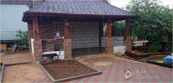 Этот вариант можно возвести наиболее быстро. Мы уже заложили основание и крепление для опор. Если вы планируете, чтобы кухня с одной или с двух сторон была закрыта стенами из кирпича или другого материала, тогда первым делом необходимо приступить к возведению этих перегородок.