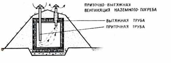 Насыпной тип погреба предусматривает наличие приточно-вытяжной вентиляции. Система вентиляции может быть выполнена с помощью двух труб (из пластика или асбестоцемента), диаметр которых составляет примерно 110–150 мм. Трубы должны быть установлены в противоположных углах погреба.