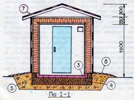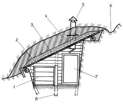 1 — дверь; 2 — слой утеплителя; 3 —пол из кирпича; 4 — глиняный замок; 5 — песчанощебеночная подготовка; 6 —внешняя гидроизоляция; 7—кровля; 8 — отмостка; 9 — вентиляция.