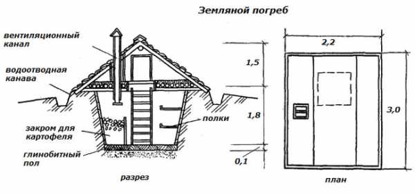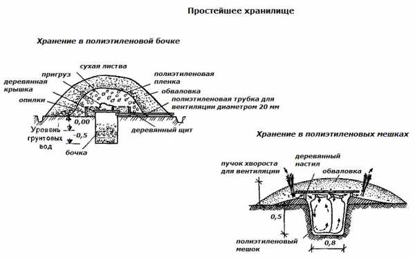 Основание этого сооружения углубляют на 1 м. Стены делают из кирпича или бетона. Бетонные хранилища рекомендуется утеплять, иначе в зимнее время температура в таком помещении может оказаться ниже нуля.
